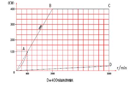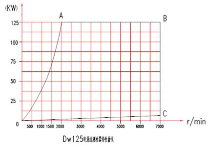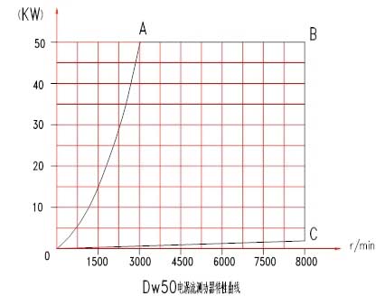 2.特性曲線 DW系列電渦流測功機特性曲線表示測功機在不同轉速下所能吸收的功率范圍,它由OABC組成。 OA—最大扭矩線。當最大扭矩為常數時所能吸收的最大功率,隨著轉速的增加而上升,在A點達到扭矩強度所允許的最大功率。 AB—最大功率線。測功機達到最大扭矩點(A)后,隨著轉速的變化測功機所允許吸收的最大功率。 BC—最高轉速線。測功機在工作時允許的最高轉速。 上述三段限線所包圍的區域為測功機的工作范圍。凡動力機或其它機械設備的動力特性在OABC所包圍的范圍內者,均能用該型測功機進行特性試驗,用戶在選用測功機時須稍留有余地。但余地太大,測試精度則難以保證。 或由OABCD組成,則AB線為主軸強度所容許的最大扭矩值,其余BC、CD線含意同上。